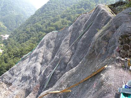 従来工法は、伐採が必要で、自然破壊を余儀なくされていたが、本工法は、人力での横持ちが可能な軽量かつ柔軟性に富む材料を使用するため、材料の移動が容易で、かつ使用機械も軽量で施工性にも優れ、種々の現場条件に適用できる。また法面成形など不要で斜面を荒らさずに施工できる。