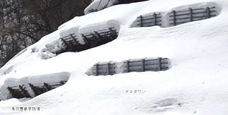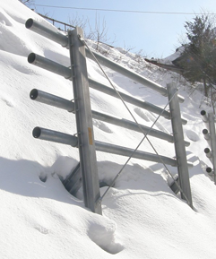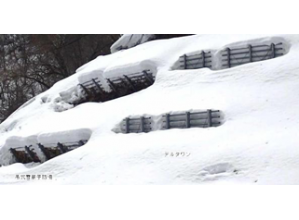 ・支持ロープを必要としない構造のため、沈降力の影響を受けにくく、柵本体の起き上がりや転倒が生じづらい。(従来の吊式雪崩予防柵の場合、柵上部への雪の堆積により、支持ロープが積雪の沈降力による荷重を受けやすくなる。特に雪の圧密が進行する融雪時にその荷重は増加し、柵本体の起き上がりや転倒が生じ、柵が破損する場合がある。)