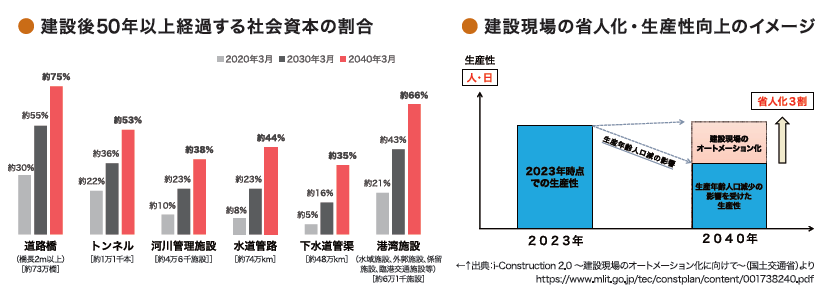 日本の生産年齢人口は2020年度の約7,509万人から2040年度には約6,213万人と約2割減少することが予測されている(国立社会保障・人口問題研究所による2023年度の推計)。人手不足や就労者の高齢化が悩みの種となっている建設業にとって、今後さらに人材確保が困難になる見通しだ。一方、高度経済成長期に全国で集中的に整備されたインフラ施設は、老朽化が加速度的に進行している。例えば約73万橋ある道路橋(橋長2m以上)は、建設後50年以上経過するものの割合が、2020年は全体の約30%だったが、2030年に約55%と半数を超え、2040年には約75%と4分の3を占めるまでに増える計算で、インフラ施設の計画的な維持管理・更新が急務となっている。さらに近年の気候変動に起因する豪雨をはじめとした自然災害の激甚化・頻発化の傾向も懸念され、建設業には災害発生時に地域の守り手として速やかに復旧・復興支援活動に当たる役割が期待されている。