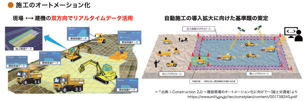 建設機械の遠隔操作による遠隔施工の普及拡大や、AIの活用などによる自動施工(建設機械施工の自動化)の実現を目指す。そのための環境整備として、メーカーの異なる複数の建設機械を制御可能な共通制御信号や建設機械の施工データ共有基盤の整備、自動施工のための標準的な安全ルールの策定を行う。現状では各建設機械メーカーがそれぞれ異なる制御システムを採用しているが、リアルタイムの施工データを双方向で取得・共有することが可能となれば、建設機械の最適配置を瞬時に判断して建設機械にフィードバックすることで、効率的な最適施工が実現できる。これは陸上工事に限らず、海上工事での作業船操作の自動化も視野に入れている。