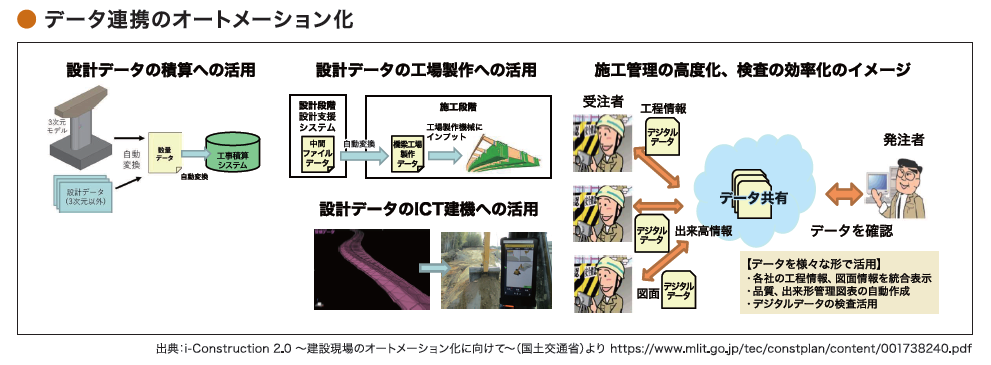次に「データ連携のオートメーション化」では、①BIM/CIMによる建設生産プロセス全体のデータの連携、②3次元モデルの標準化と契約図書としての活用に向けた取り組み、③デジタルツインの活用による現場作業の効率化、④施工データの活用の効率化、⑤データ活用による書類の削減-を推進する。