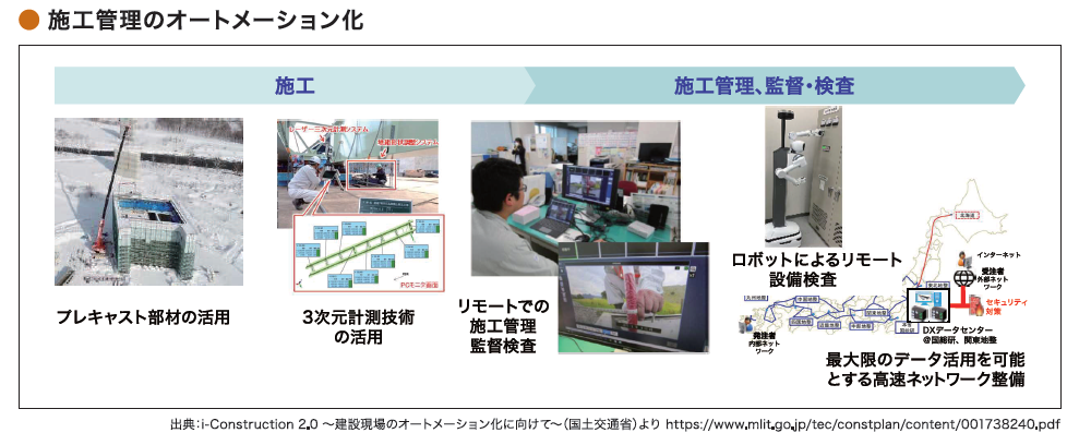 3つ目の「施工管理のオートメーション化」に向けては、①リモート監督検査、②ロボットによるリモート検査、③高速ネットワークの整備、④プレキャストの活用、⑤ドローンやAIなどの先進技術の積極的な活用-を進める。