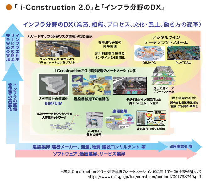 国交省は建設現場の生産性向上を狙いに2016年度から行動計画となるi-Constructionの取り組みに着手。2020年からは技監を本部長とする「国土交通省インフラ分野のDX推進本部」を設置し、建設現場の生産性向上に加え、デジタル技術の積極的な活用によって建設業の働き方の変革を目指す「インフラ分野のDX(デジタルトランスフォーメーション)」を強力に推進している。インフラ関連の情報・サービスの提供を含めて、デジタル技術やデータの効果的な活用を図ることで、業務、組織、プロセス、文化・風土や働き方の変革を目指す取り組みは、建設現場の省人化対策を盛り込んだi-Const ruction2.0の取り組みと当然ながら軌を一にしている。建設産業が国民生活や経済活動の基盤となるインフラ施設の整備・維持管理を通じて将来にわたって社会的使命を果たし続けていくためには、エッセンシャルワーカーである建設産業従事者が少ない人数で、安全に、快適な環境で働くことができるよう、建設産業の仕事のあり方そのものを自ら変革していく必要がある。