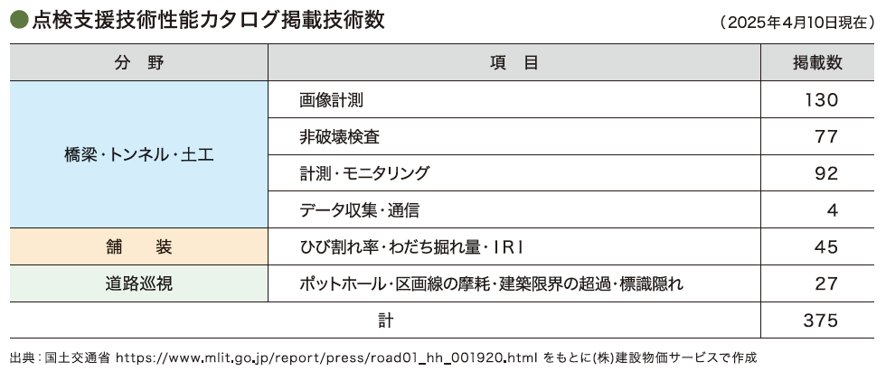 掲載技術は当初、「橋梁」と「トンネル」の19技術からスタート。その後、民間の活発な技術開発姿勢を反映して対象分野と掲載技術数が年々増加。2022年度に「舗装」、2023年度に「道路巡視」と「土工」分野の掲載を開始し、2025年4月現在、合わせて375の点検支援技術が掲載されている。国交省は直轄国道の点検において、2022年度から橋梁・トンネル、2023年度から舗装、2025年度からは道路巡視を含め、特定の項目について点検支援技術の活用を原則化しており、基本的にカタログ掲載技術の中から選定している。