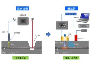 コンクリート中の鉄筋を電磁力で非接触に振動させ、鉄筋の腐食状況を診断する技術。
