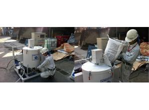 水中不分離性コンクリート用混和剤を半自動でスラリー製造および投入することのできる技術である。 スラリー化するための水と流動化剤を、それぞれ1車当たりの投入量を設定し流量計と電磁弁により自動で正...