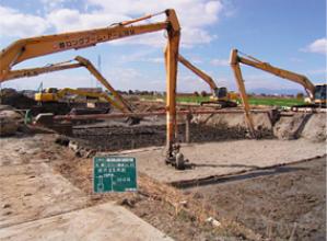 改良の対象土となる原位置土に適合した固化材および添加量をバックホーにて均一に散布を行い、バックホー先端に取り付けた撹拌機を土中に挿入し、固化材と原位置土を撹拌混合する工法。