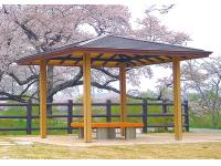 3寸勾配屋根の落ち着いた佇まい。アルミ屋根や合成木材柱など、耐久性を高めた四阿。