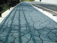 型枠(型紙)を使用したカラー舗装。型枠は様々な種類を用意しており、全 13 色の着色も可能。特殊なポリマーセメントを使用しているので耐久性もある。
