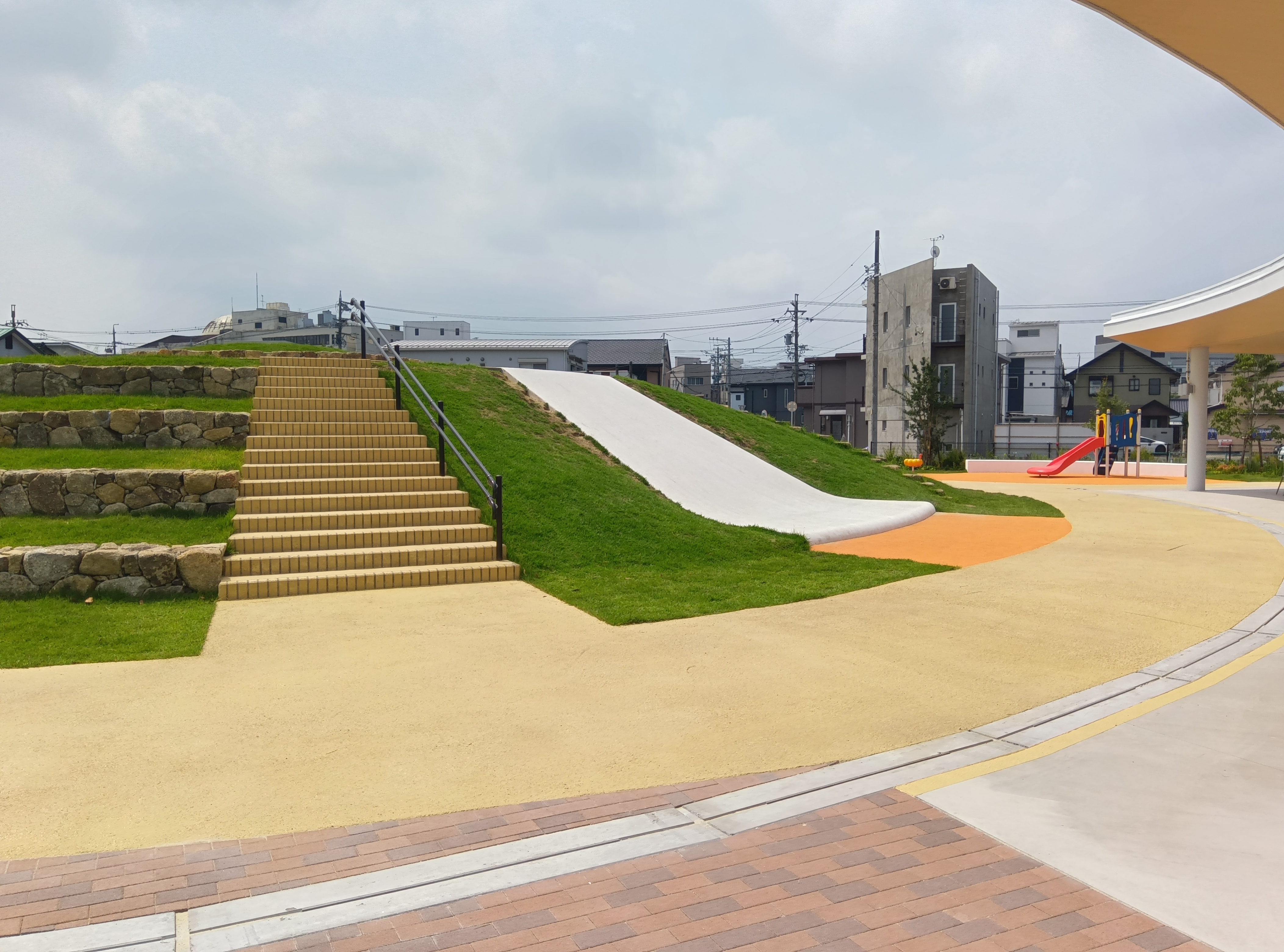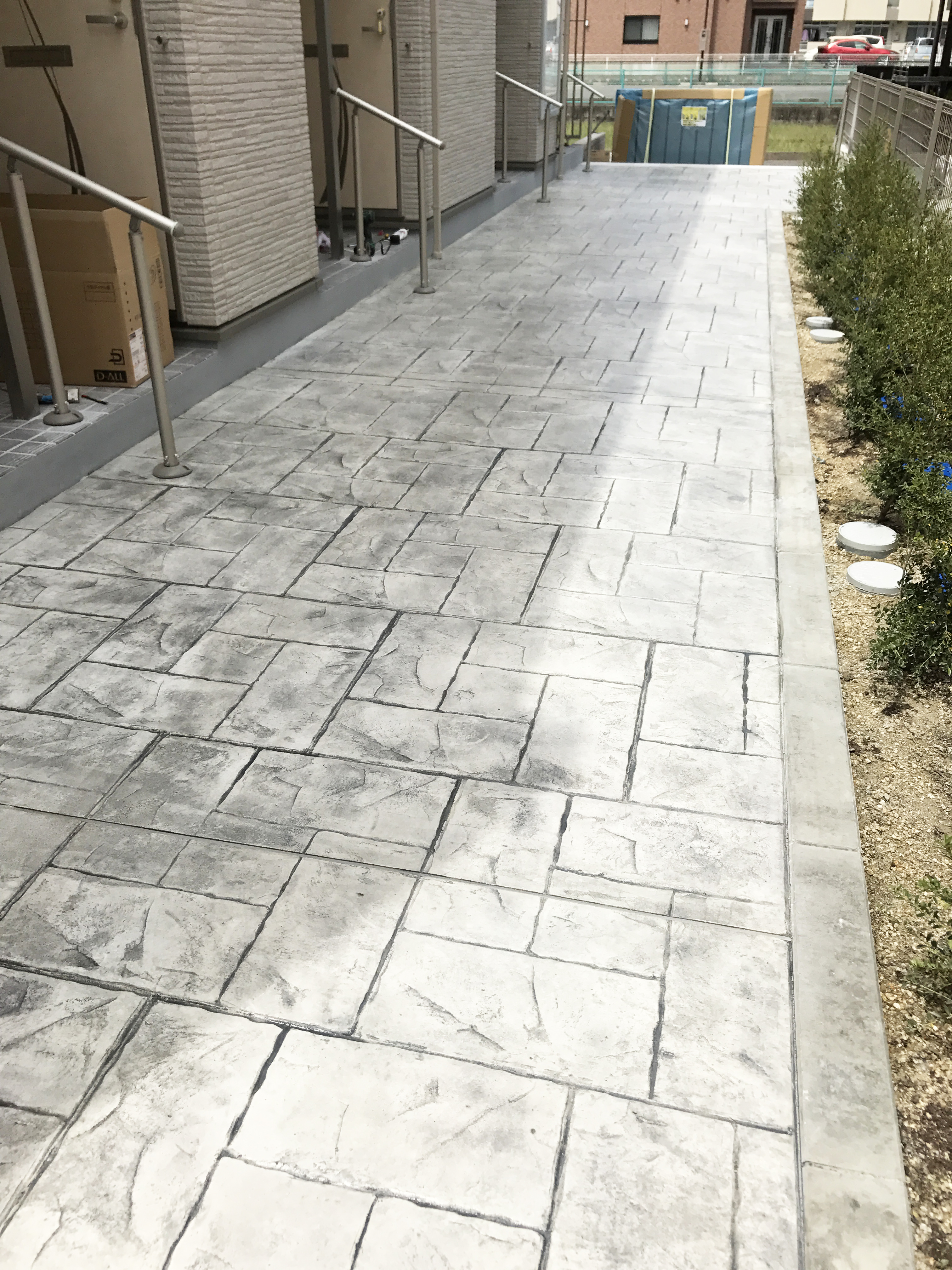 ステンシル目地を貼り付け、ホッパーガンでスプレーし、デザイン性のある床面を表現する景観舗装工法。