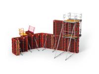 「壁と柱、そしてスラブにも使用できる」というコンセプトのシステム型枠。部材数が少なく軽量・組立が容易で、70~100回転用できる100%リサイクル可能な樹脂製システム型枠。