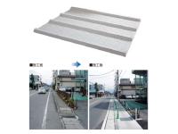 GRC製側溝用埋没型枠。 既設の道路側溝のコンクリート蓋を現場打ちコンクリートで施工する際、コンクリート蓋の埋設型枠として用いられるGRC(耐アルカリ性ガラス繊維補強コンクリート)製の薄板である。