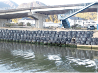災害復旧事業における応急対策工事や中長期の公共工事などに活用する最長3年設置できる耐候性大型土のう袋。