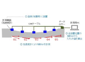 橋面上に置いた加速度計のデータから車両通過時の橋梁たわみを算出する技術