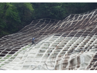 不安定になりがちな急勾配のり面をソイルクリートで保護しながら「勾配緩和網」の設置により確実な緑化が可能になる。