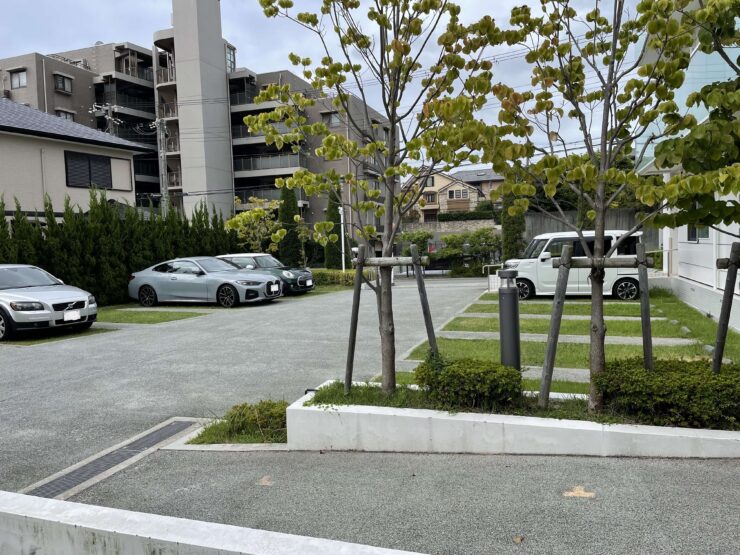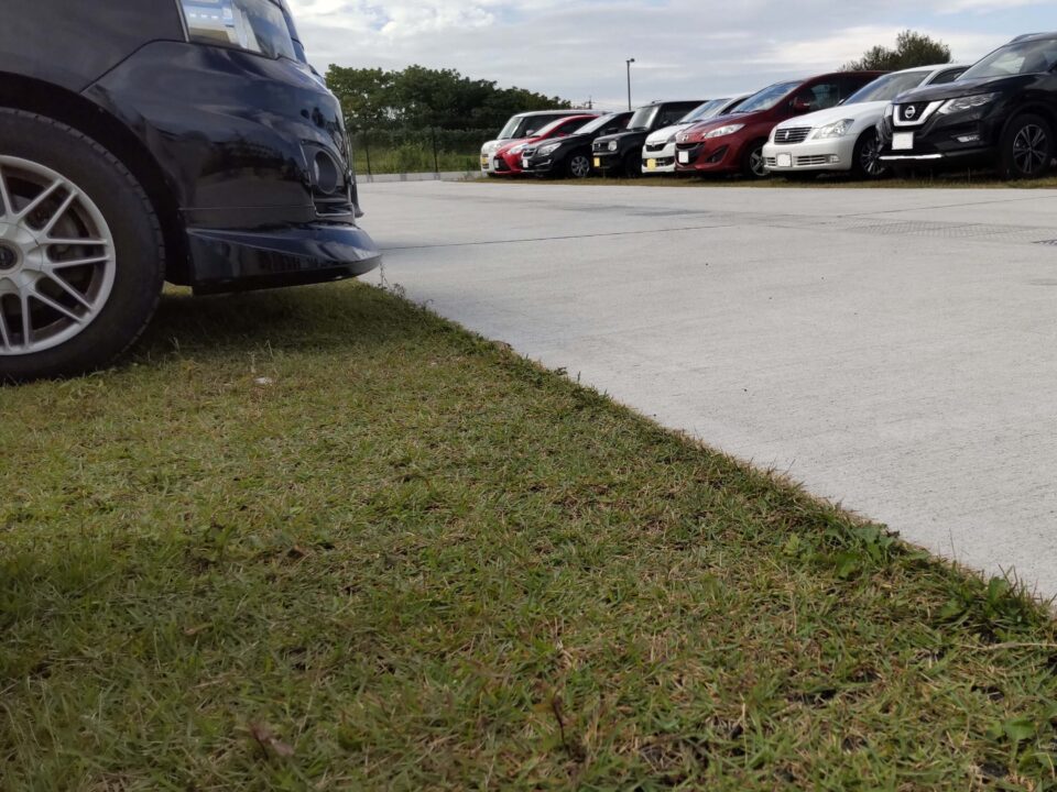 車両の踏圧による固結を防ぎ、根の生育層を確保した構造で芝生を維持する緑化駐車場(路盤層一体型駐車場緑化工法)