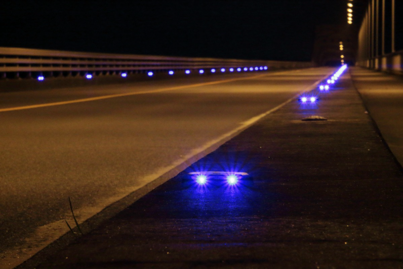 交差点中心に埋設し、交互点滅によって交差点の有無を明示する自発光式道路鋲。車のヘッドライトが当...