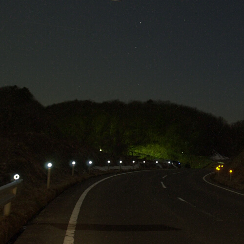 複数の製品が標準電波(JJY)を元に、ぴったり同じタイミングで点滅する。これにより光が連続するように見え、道路線形が把握しやすくなり、人の視線を特定の方向へ自然に誘導することが可能である。