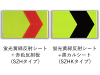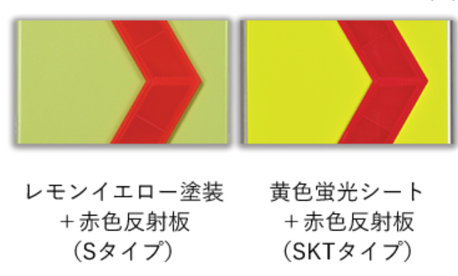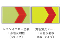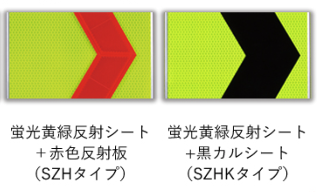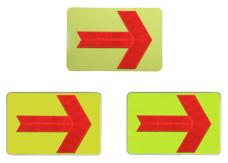 矢印型の反射板で道路の線形を明示する板面400×600サイズの線形誘導標。設置箇所に応じて様々な設置タイプがある。 基板の表面仕上げは「塗装(ASタイプ)」「蛍光シート(ASKTタイプ)」「反射シート(ASZHタイプ)」の3パターンある。