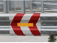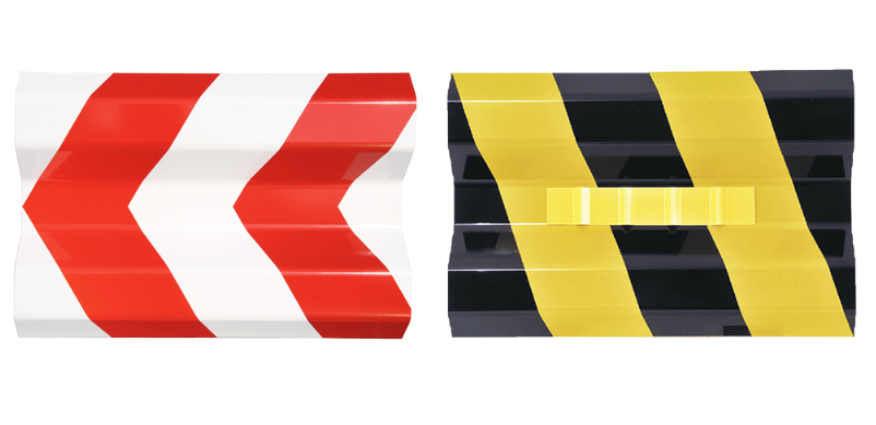 ガードレールのビーム部に取り付けるガードレール用反射体。簡易に施工できガードレールと一体化する反射体はドライバーへの注意喚起をする。 アロー柄は道路線形を明示、ゼブラ柄は注意箇所の明示としての使用。中央に反射体(ウェーブライトラインHG)を使用したWLLタイプは側面からの視認性がさらに向上した。