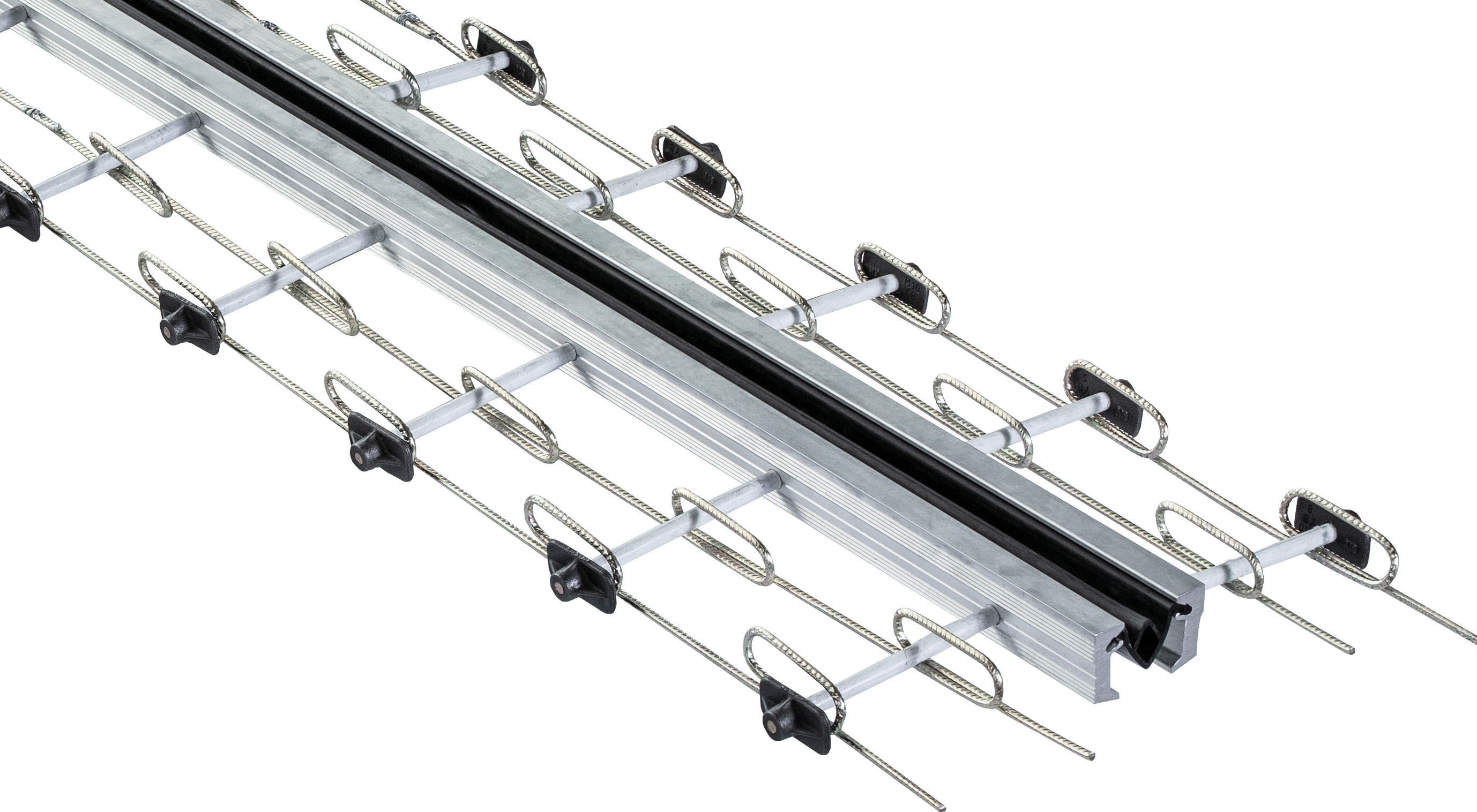 - 本体はアルミ合金の押出成形で優れた耐食性・耐候性を有する。PC鋼棒によるプレストレス導入方式による定着で後打ちコンクリートにしっかりと固定され経年劣化による緩みやガタつき、雨水の侵入しやすい隙間の発生を抑制します。止水ゴムは橋面上からのはめ込み施工のため最長25mまで継ぎ目なく施工が可能。