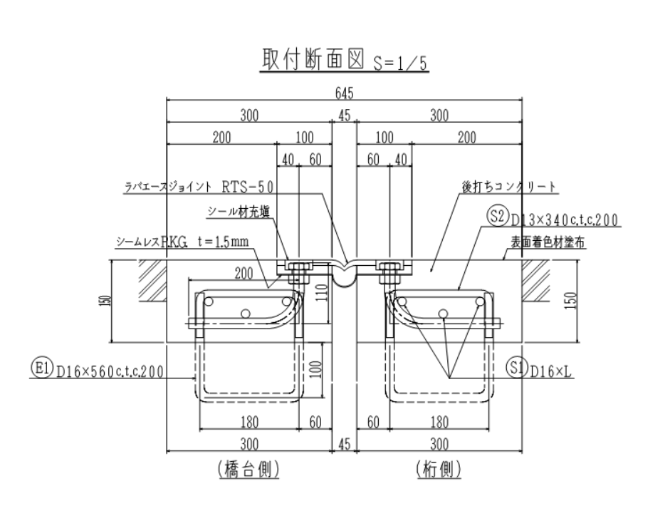 - 1.8mの定尺に分割されており、取扱いが容易で迅速な施工が可能。「セッター工法(特殊型枠)」によりアンカーボルトの正確な位置決めが可能。単純構造のため後打ちコンクリートの打設充填が容易。鋼床版にも対応が可能。
