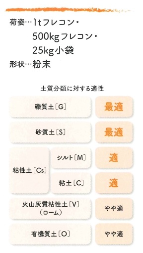 生石灰に改良効果を高める添加材を配合し防塵加工を施した、低コスト型の固化材である。