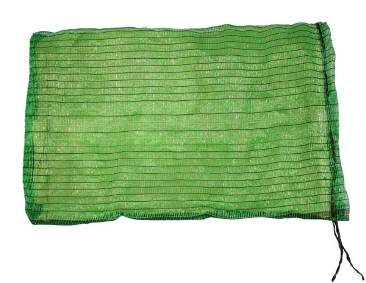 ポリエチレン製の遮光ネット袋(緑色)に種子、肥料を水溶解紙に接着した植生土のう。