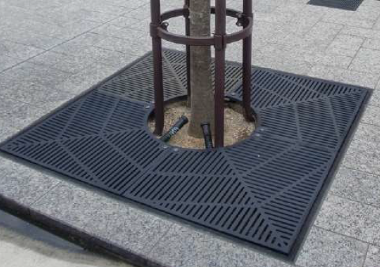 街路樹などの根元を車や人の踏圧から守り、雨水などが浸透しやすいように樹木を保護する製品。
