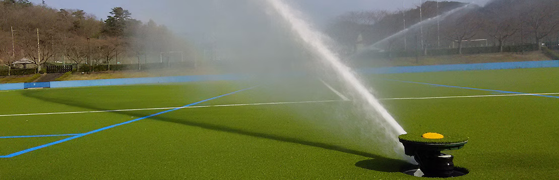野球場、陸上競技場などの激しい運動をする広い土地への散水におすすめのシステム。サイドから広範囲...