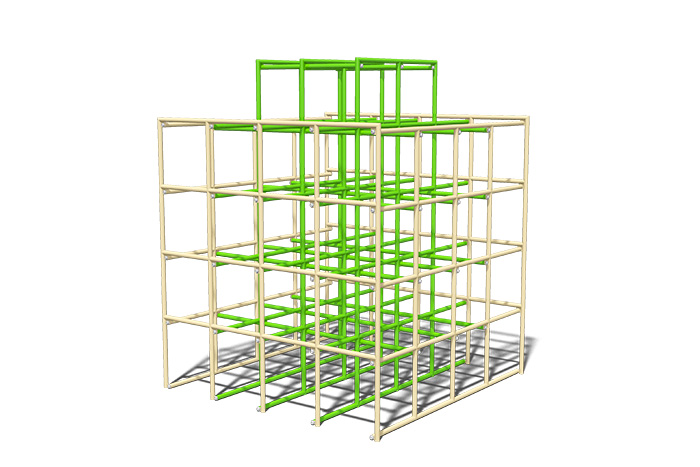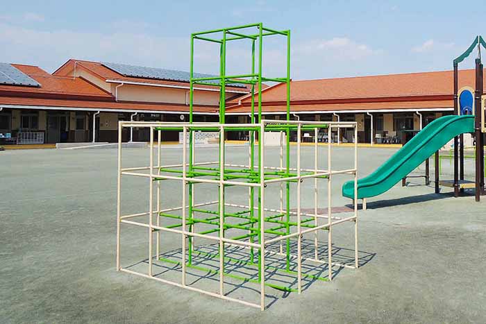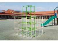 子ども達が活発に動きまわれる9つのユニットをPEステップでジョイントした新しいジャングルジム。