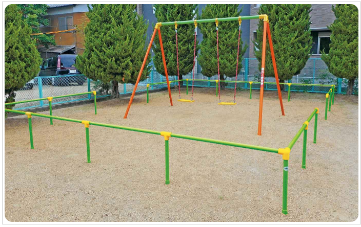 ■二人乗りブランコ 時代を超えて多くの子どもたちに親しまれてきた遊具。 揺動系遊具は楽しさばかりではなく、最近の子どもたちが弱くなっているといわれるバランス感覚の育成や、さまざまな動作の習得に有用な遊び機能を提供する。
