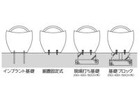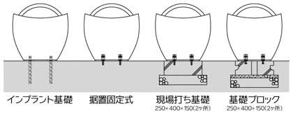 ▪据付方法は、「インプラント基礎」「据置固定式」「現場打ち基礎」「基礎ブロック」(別売)の4方式。