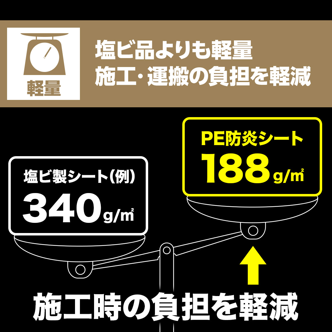 ・防炎クロスは従来と比較して軽いため、敷設・撤去における作業者の負担が軽減できる。