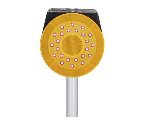 φ300の反射部にLED24球を配置して高い視認性をもたせた大型の自発光式障害物表示灯。筐体と太陽電池が一体型で、中央分離帯ノーズ部への設置に適している。 ※ソーラー製品設置に当ってのご注意:日照が十分得られる場所に設置をする(特に、午前10:00~午後3:00まで日照が得られる場所)。 また、夜間でも明るい場所や、十分な日照が得られない場所には設置しない(例:街路灯の直下/トンネル内/樹木の影/高架下など)。