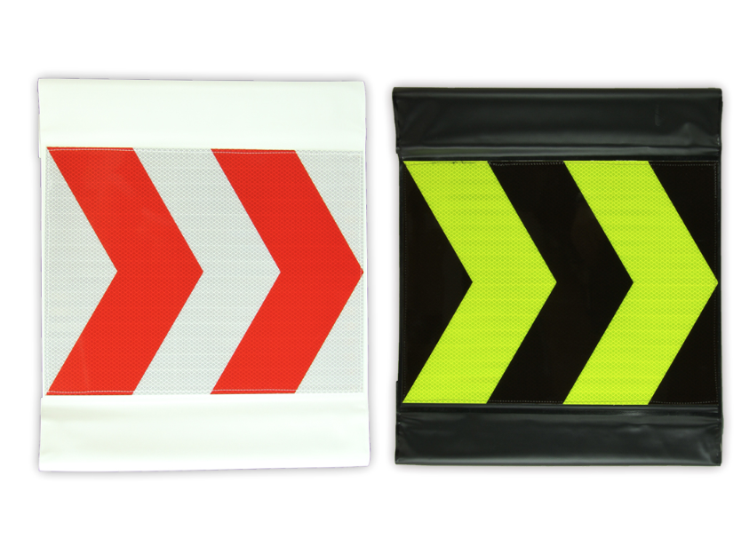矢印型の反射板で道路の線形を明示する板面400×600サイズの線形誘導標。設置箇所に応じて様々...