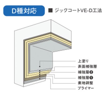 https://www.k-mil.net/construction_methods/detail/2982 高耐薬品性のピニルエステル樹脂を適用した工法で、 B種は積層仕様(補強材無し)、 C種と D種は補強材積層仕様(ガラスマット積層)のビニルエステル樹脂工法で高濃度の薬品にも優れた性能を発揮する。※耐有機酸性の品質規格を取得している。