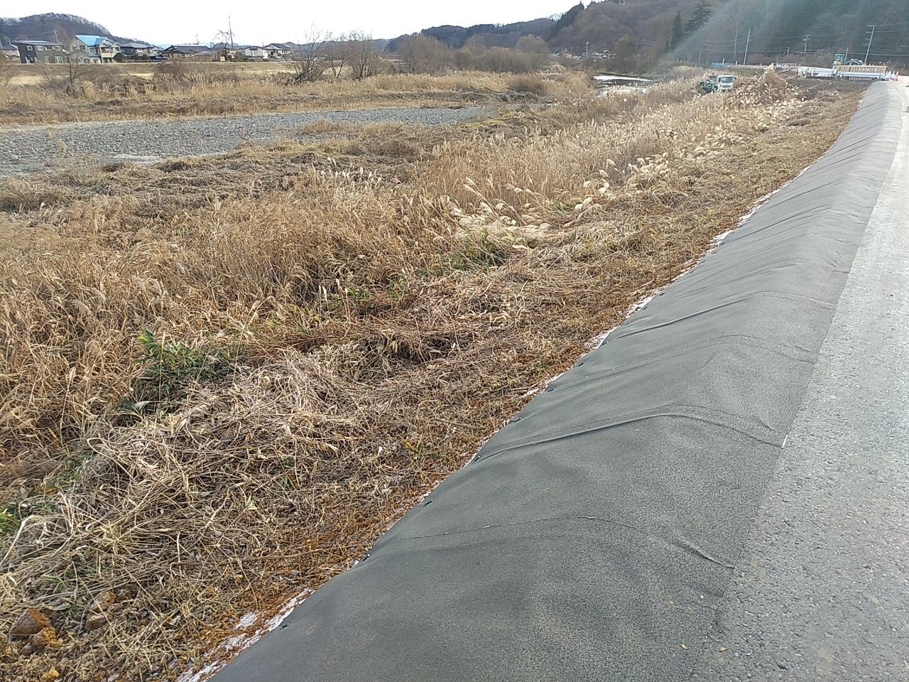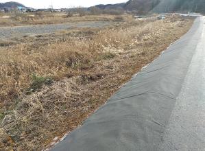 道路路肩等で繁茂する雑草について、10年の耐用年数を持つ防草シートにより雑草が生えてこない状態...