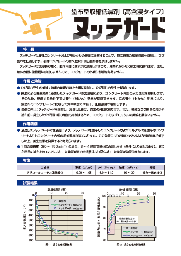硬化コンクリートおよびモルタルの表面に塗布することで、特に初期の乾燥収縮を抑制し、ひび割れを低減します。躯体コンクリートの耐久性状に何ら悪影響を及ぼさない。含浸性が高く、躯体内部に速やかに浸透しますので、液垂れが少なく施工性に優れている。また、躯体表面に塗膜層は形成しませんので、コンクリートの外観に影響を与えない。