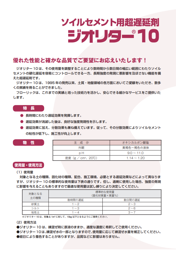 その使⽤量を調整することにより数時間から数⽇間の幅広い範囲にわたりソイルセメントの硬化遅延を容易にコントロールできる⼀⽅、⻑期強度の発現に悪影響を及ぼさない機能を備えた超遅延剤である。 1995年の発売以来、⼟質・地盤領域の各⽅⾯において、数多くの実績を得ている。