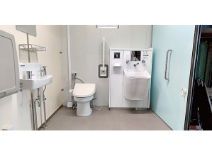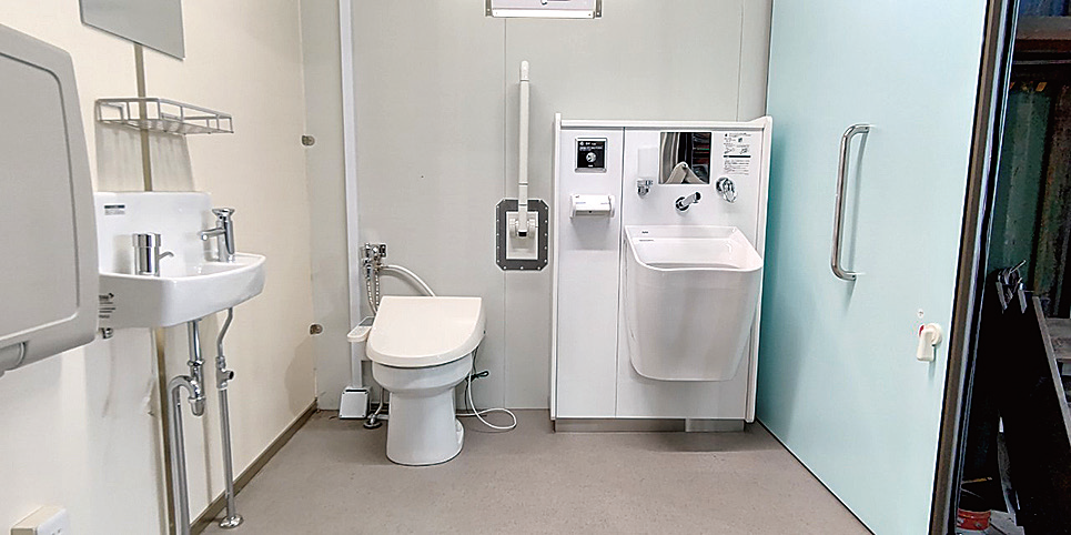 バリアフリー対応の車いす個室付き高機能トイレユニット。