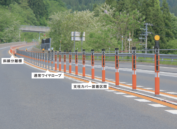 暫定二車線区間などの対面通行道路で、車線分離用に設置されるワイヤロープ式の防護柵に取り付けられ...