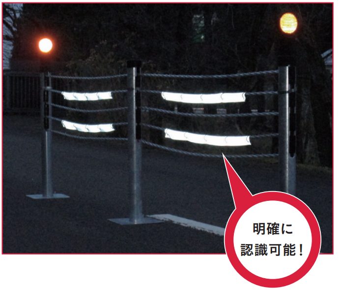 柔軟性と耐候性の高いゴムを使用し、全面に再帰性反射材ガラスビーズを塗布した反射シート。ワイヤロープ式防護柵の高い安全性を保持したまま、ワイヤロープ部を可視化させ、運転者へ道路の線形を誘導することで事故発生の危険性を低減する。 車両が走行しやすく快適で安心安全な道路環境を実現するため、薄暮時・夜間・悪天候下におけるワイヤロープへの衝突事故を防止する。