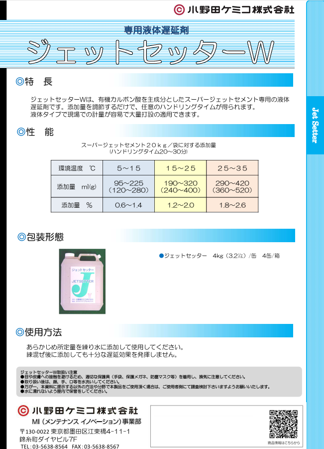 ジェットセッターWは、有機カルボン酸を主成分としたスーパージェットセメント専用の液体遅延剤です。