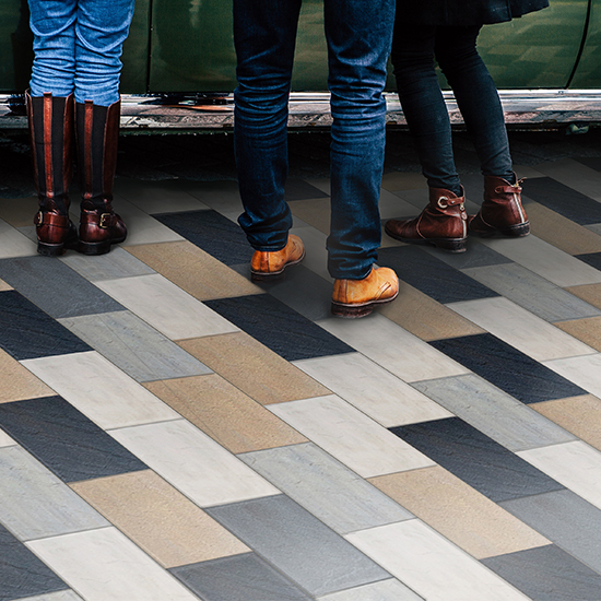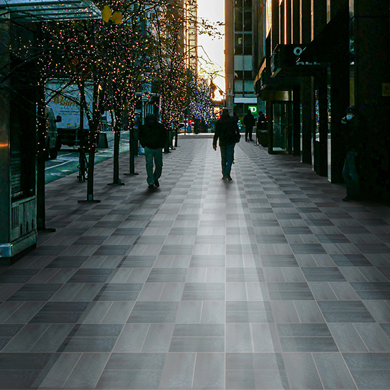 あらゆる空間へのコーディネートが可能な7色のグレートーンを揃えている。多色の組み合わせでも単色で並べても、ランダム加飾の自然な色幅により上質な風合いの舗装空間を創出する。ペデストリアンデッキや駅前広場、さまざまな公共場所においてもシーンを問わず使用可能である。