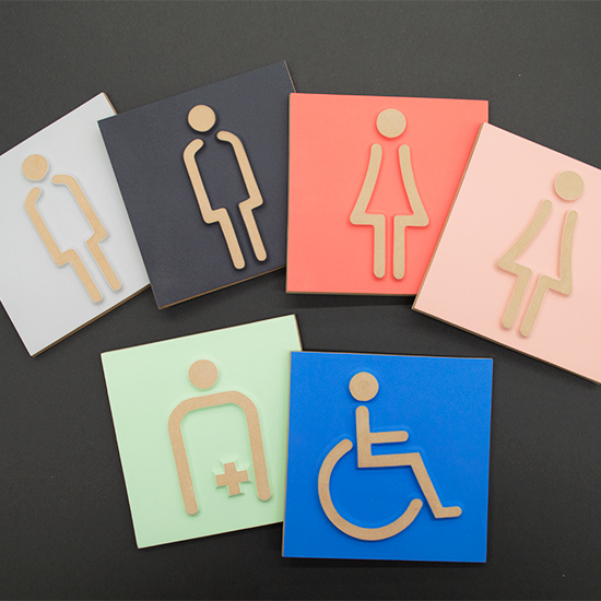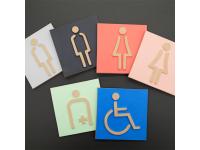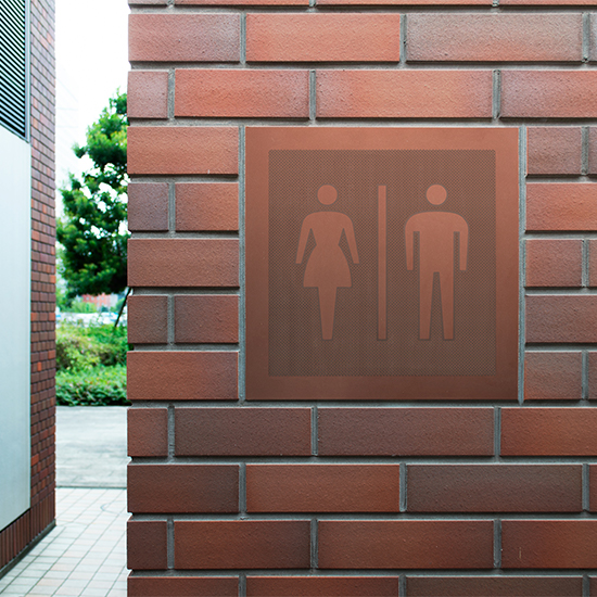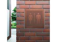 職人の丁寧な手仕事で立体的に作り上げたピクトサインタイル。焼き物の素地の温もり感は公共性の高い空間(屋外共用トイレ、車椅子用トイレ等)で存在感を発揮する。オリジナルピクトグラムでの製作も対応可能。