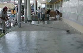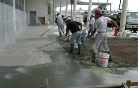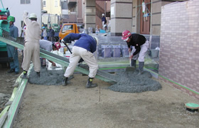 施工箇所に生コンを打設。コンクリートの配合は呼び強度21N/mm2以上、スランプ8〜18cm程度のものを気象条件、現場状況などに合わせ選定。