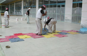 施工面に型押し用スタンプマットを置き、端から順にスタンプして型の模様を転写。いたマットはすぐにはずし順に前に送りながら繰り返し模様を転写。