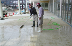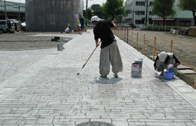 コンクリートの表面に模様を転写して、あたかもレンガや敷石、木材と見間違うような表情豊かな床面を作り出すことができる工法。