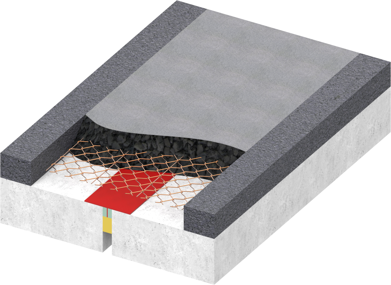 - 特殊合材の特性と中間に敷設された伸縮メッシュにより、桁の伸縮を均等に分散し、吸収する構造である。
